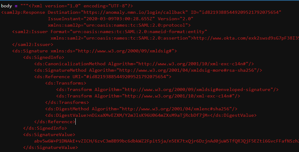 email = [i.text for i in tree.iter() if i.tag =='{urn:oasis:names:tc:SAML:2.0:assertion}NameID'][0].strip()