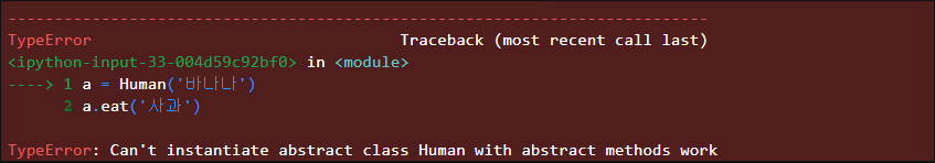 위 추상 클래스에서 선언한 두개의 eat, work 메서드가 Human class의 method에 모두 작성되지 않았으므로