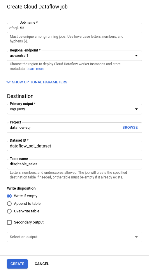 쿼리를 작성한 후 Cloud Dataflow 작업 만들기를 누른후 설정값 입력