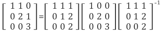 한 예로, A = [1 1 0; 0 2 1; 0 0 3]인 경우 A는 다음과 같이 대각화가 가능하다.
