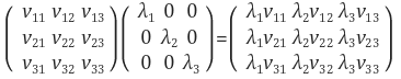 먼저 대각행렬과의 행렬곱에 대해 살펴보면, 대각행렬을 뒤에 곱하면 행렬의 열벡터들이 대각원소의 크기만큼 상수배가 된다(앞에 곱하면 행벡터들이 상수배가 된다). 예를 들어, 3 x 3 행렬의 경우를 보면 다음과 같다.