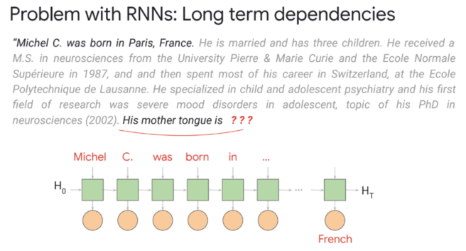 - RNN은 긴 시퀀스의 문장을 다룰때 학습시키기가 힘듦 → 이것을 Long term dependancies 라고 함