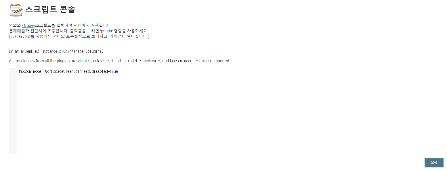 젠킨스관리 -> 스크립트 콘솔로 들어가 아래 커맨드를 실행 시켜 WorkspaceCleanupThread 가 동작하지 않도록 설정을 바꿔줌