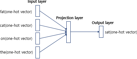 투사층에서 벡터의 평균을 구하는 부분은 CBOW가 Skip-Gram과 다른 차이점이기도 합니다. 뒤에서 보게되겠지만, Skip-Gram은 입력이 중심 단어 하나이기때문에 투사층에서 벡터의 평균을 구하지 않습니다.
