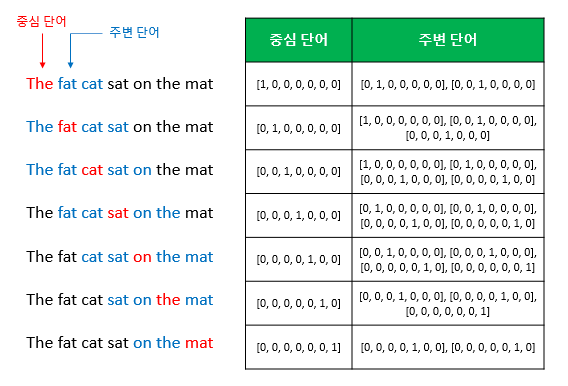 예를 들어서 갖고 있는 코퍼스에 위와 같은 문장이 있다고 합시다. 가운데 단어를 예측하는 것이 CBOW라고 했습니다. {"The", "fat", "cat", "on", "the", "mat"}으로부터 sat을 예측하는 것은 CBOW가 하는 일입니다. 이 때 예측해야하는 단어 sat을 중심 단어(center word)라고 하고, 예측에 사용되는 단어들을 주변 단어(context word)라고 합니다.