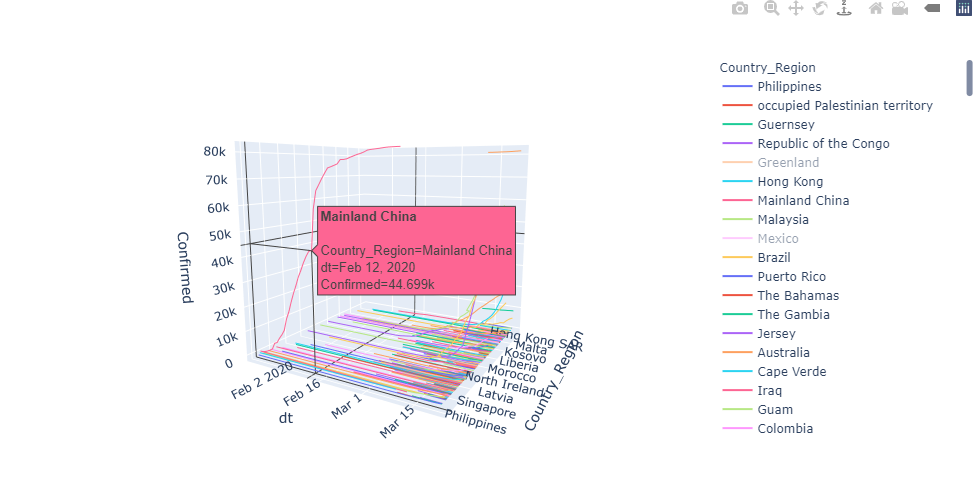 fig = px.line_3d(df_dt, x='dt', y='Country_Region', z="Confirmed",hover_name='Country_Region',color='Country_Region')