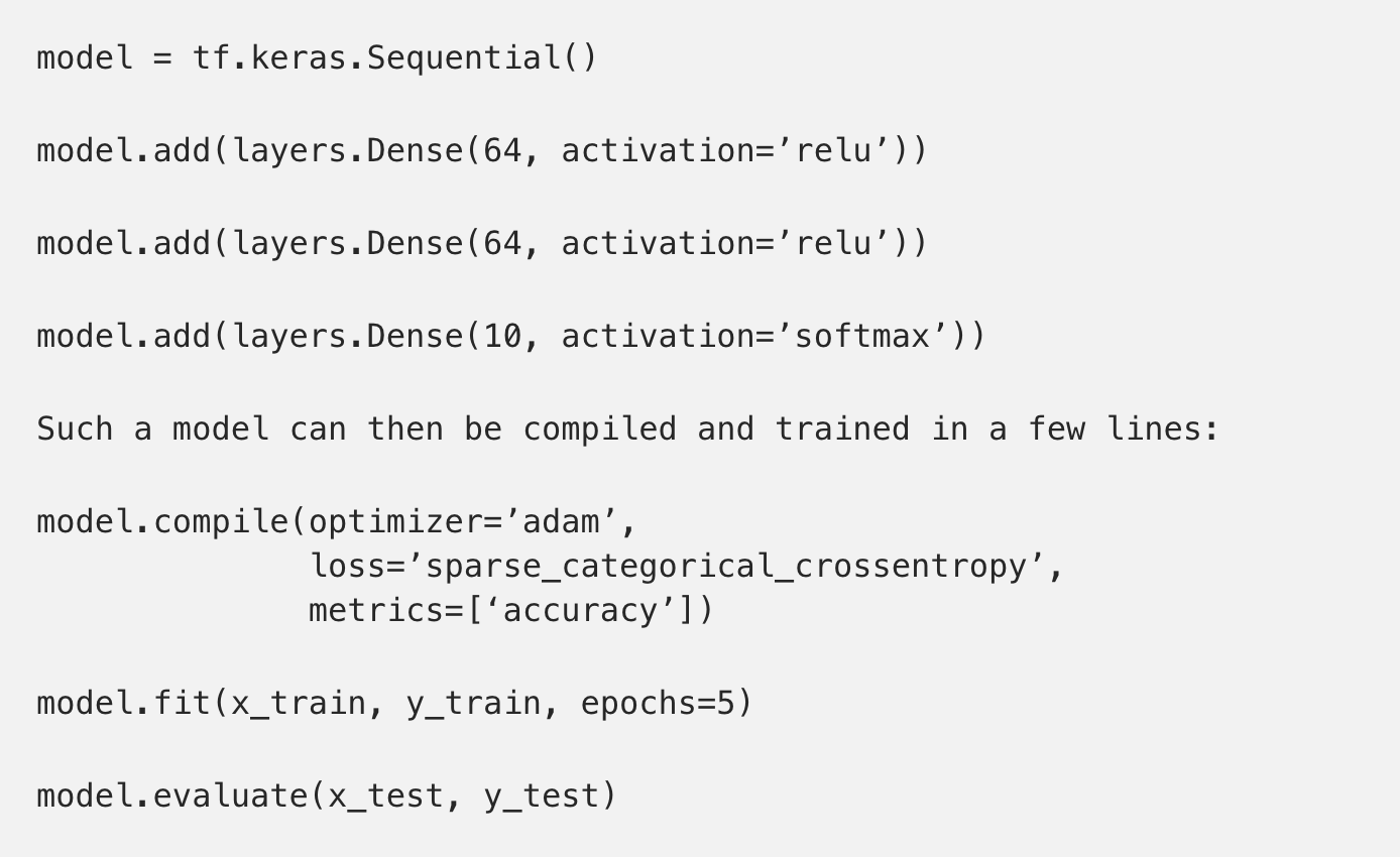 ML을 배우는 학생이라면 tf.keras Sequential API로 시작하실 것을 권장합니다. 직관적이고 간결하며 사실상 ML 문제의 95% 정도에 적합한 API이기 때문입니다. 이 API를 사용하면 대략 10줄 정도의 코드만으로 생애 최초의 신경망 프로그램을 작성하실 수 있을 겁니다.