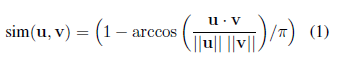 문장 유사도 비교를 위해 식1에서 보여지는 것처럼 angular distance를 사용함
