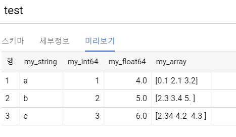이것을 Bigquery에 그냥 올리면 아래와 같이 string 형태로 올라가지만