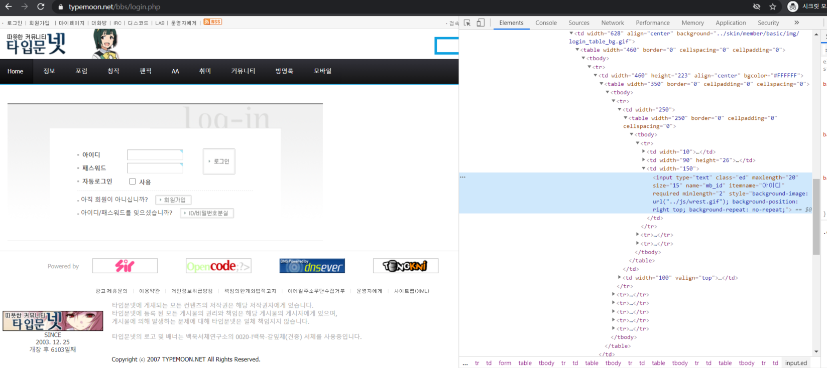 로그인 페이지에서 f12를 눌러 id란과 password란에 name 값을 알아온다.