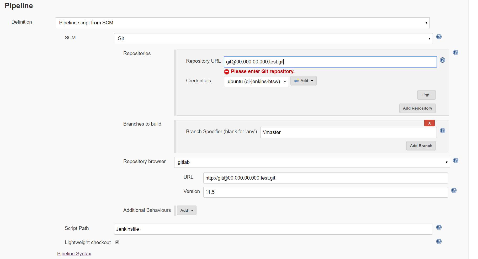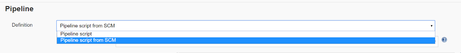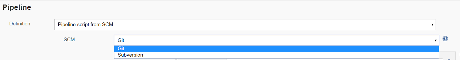 파이프라인 설정 방법은 직접 script 작성 외 SCM (Source Code Management)으로 부터 파이프라인을 불러와 실행 시킬 수 있음