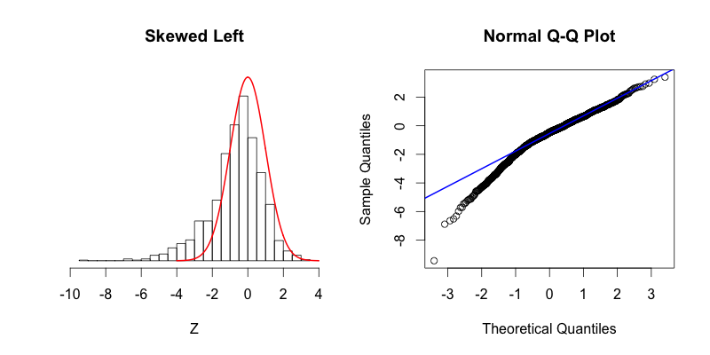 각 점들의 확률변수가 작아지므로 Q-Q plot 상의 각 점이 직선 아래로 향함