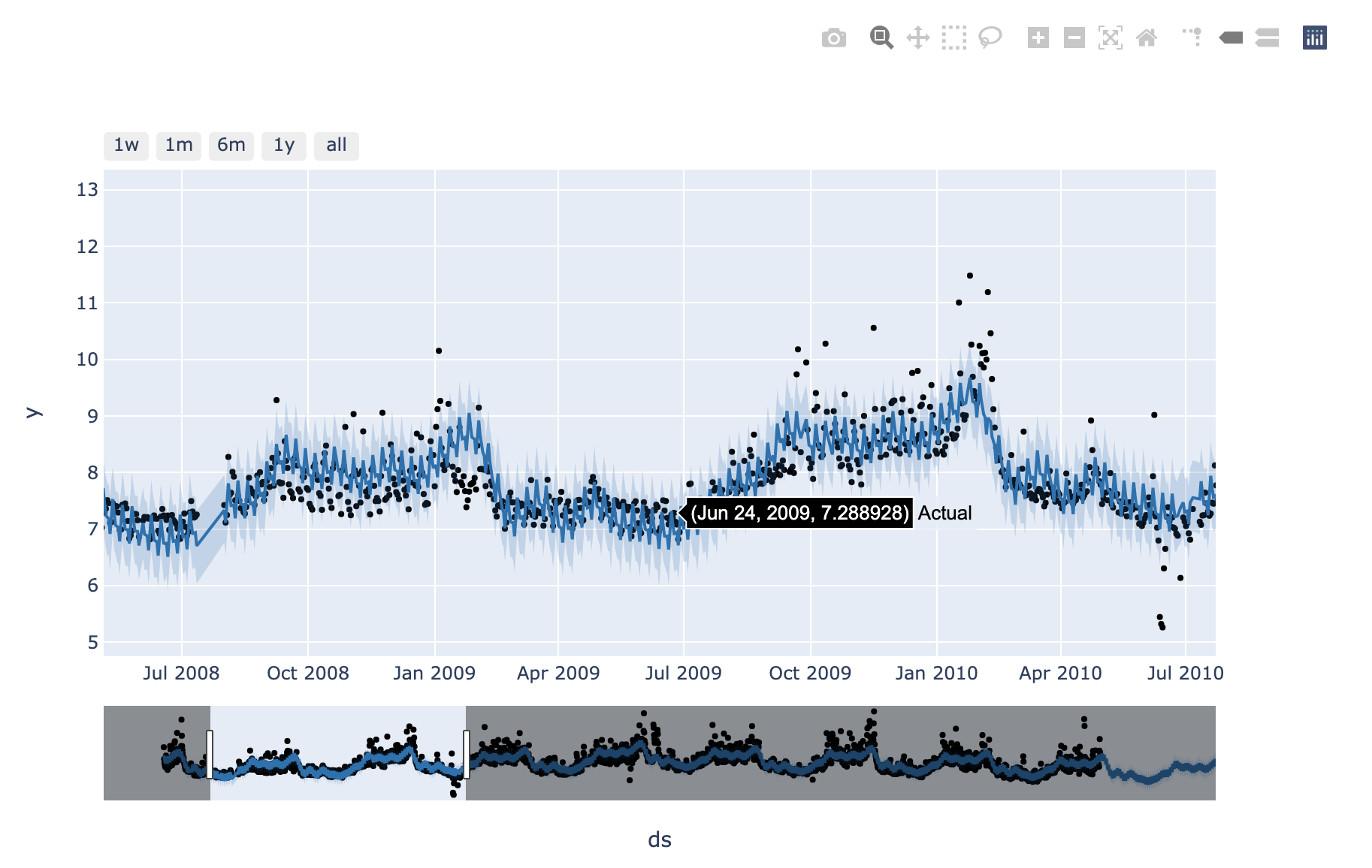 - 예측이 이루어질 ds날짜가 포함 된 열이있는 데이터 프레임에서 예측이 이루어짐