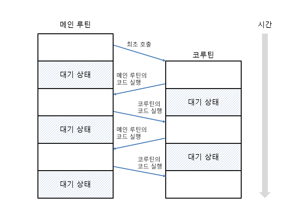 위 그림처럼 코루틴은 함수가 종료되지 않은 상태에서 메인 루틴의 코드를 실행한 뒤 다시 돌아와서 코루틴의 코드를 실행한다.
