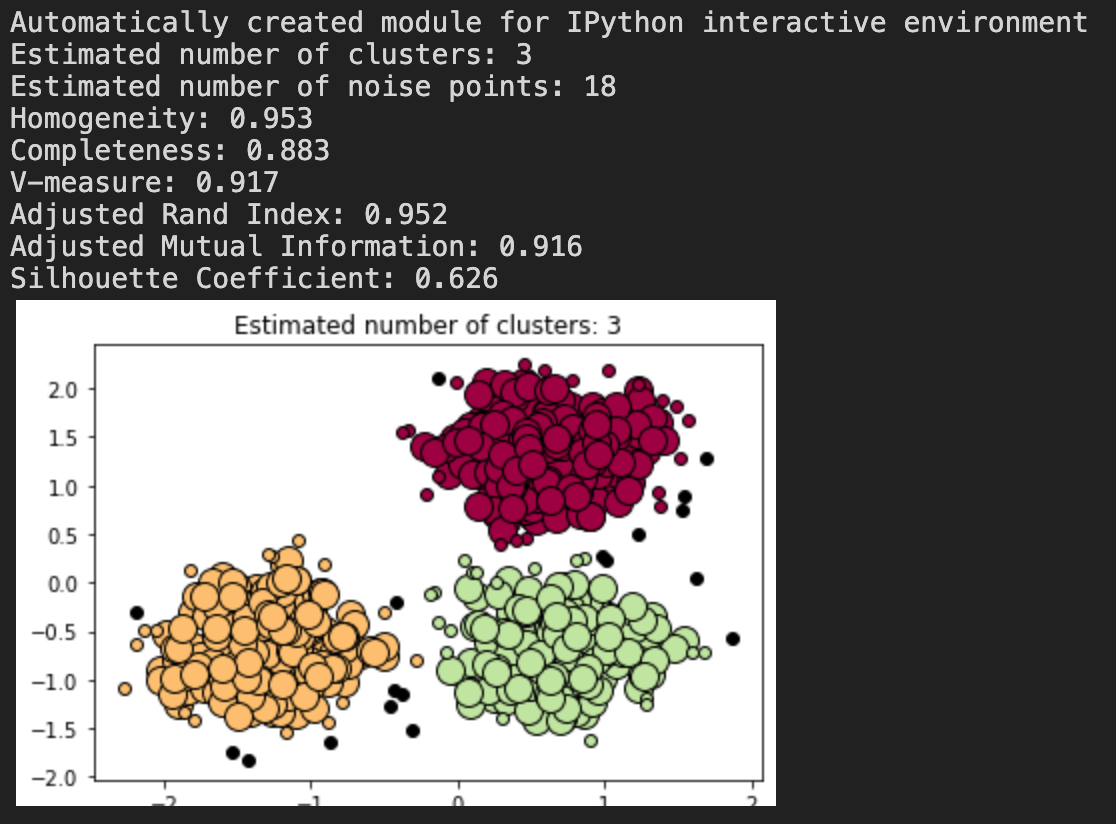 Note Click here to download the full example code or to run this example in your browser via Binder Demo of DBSCAN clustering algorithm Finds core samples of high density and expands clusters from them. Out: Estimated number of clusters: 3 Estimated number