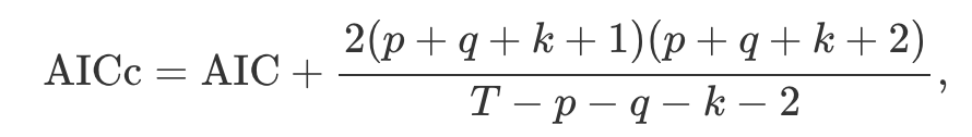ARIMA 모델에 대해, 수정된 AIC는(AICc) 다음과 같이 쓸 수 있습니다.