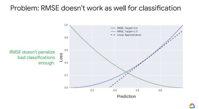 > classifier에서 RMSE를 사용할 경우, 모델이 정답을 다 틀려도 loss는 1밖에 안되기 때문에 모델을 적합화시키는데 어려움