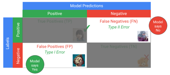 > False Negatives : prediction of mode(모델의 예측값) : 0 → Negative,