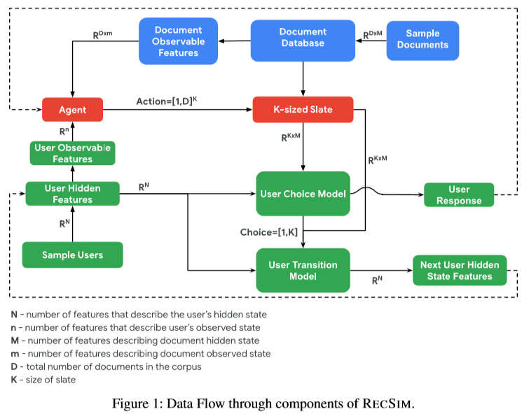 - user, docuent, user-choice 모델은 유저에게 documents의 후보를 추천함으로써 서로 환경에 영향을 주기 때문에, Recsim은 관찰할수 있는 유저와 후보 documents feature를 사용하여 추천을 구성함