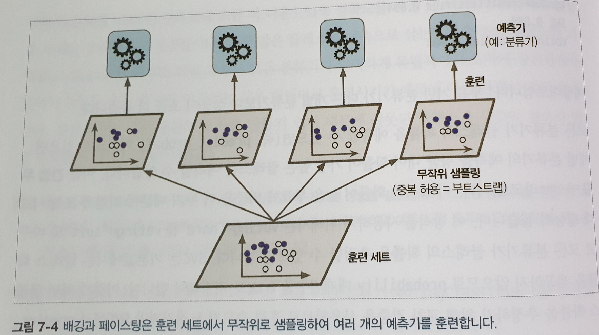 배깅과 페이스팅 모두 훈련세트의 서브셋을 무작위로 구성하여 다양한 알고리즘을 학습시키고 각 알고리즘의 결과를 종합하여 최종 결과를 내놓는 방식(앙상블)이다.