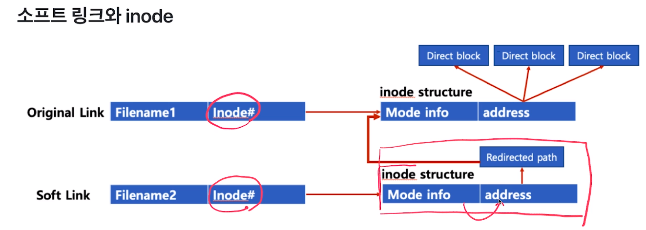 차이 : 파일명이 다른데 inode의 번호가 같음(원래는 파일별 inode번호가 다르지) → cp 는 inode번호가 다름..structure 자체가 다를 것(복사)