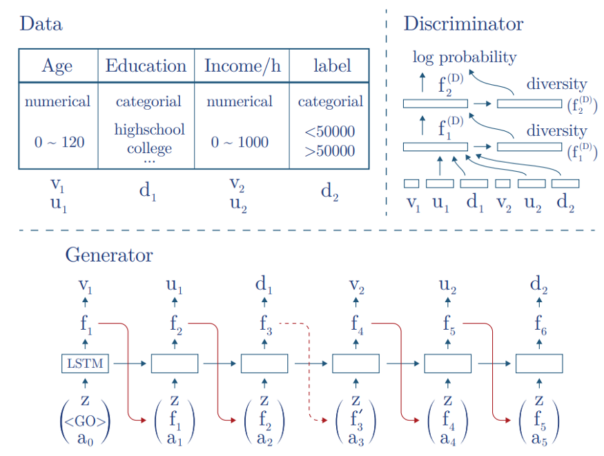 - 범주형 변수 : Due to usually low cardinality, they found the probability distribution can be generated directly using softmax. But it necessary to convert categorical variables to one-hot-encoding representation with noise to binary variables