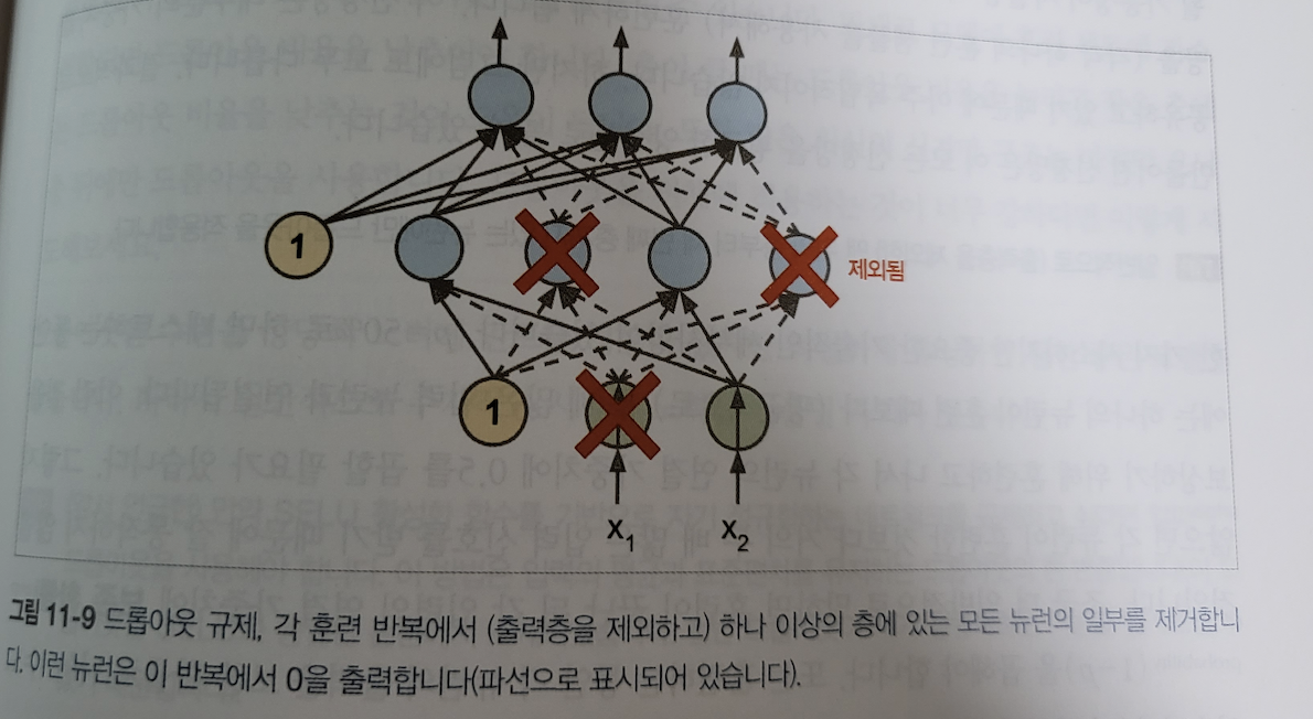 드롭아웃 : 심층 신경망에서 가장 인기있는 규제 기법 중 하나 (2012년 제프리 힌턴이 제안)