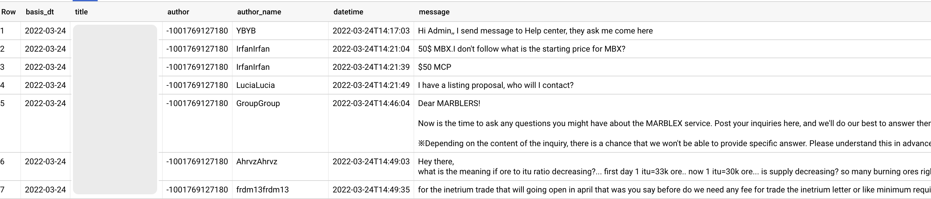 title, author, author_name, datetime, message, basis_dt = [], [], [], [], [], []