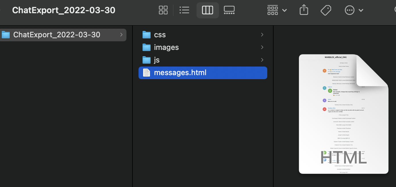 4. 내보내고 나면 챗의 경우는 .html 파일로 받아볼수 있고, html 파서를 이용하여 데이터를 수집하면 된다.