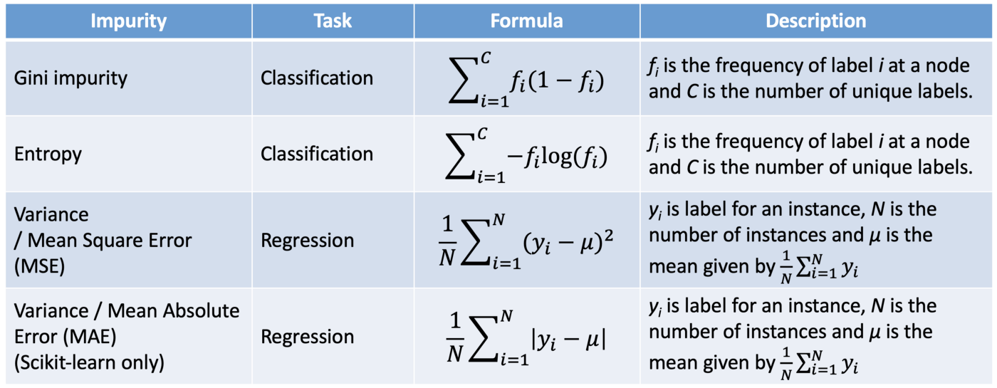 - categorical, numeric features 모두 사용하며 정보의 불순도를 이용해 분류문제를 풀고,