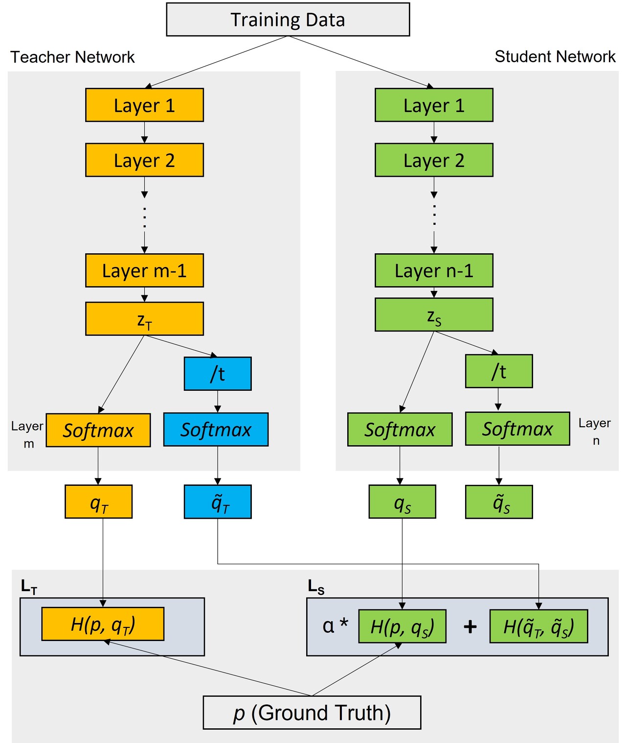- 복잡한 딥러닝 모델 (teacher model)은 많은 수의 파라미터를 가지고 있다. 이러한 학습치(지식)를 경량화 모델(student model)에 전달해주는 즉, transfer해주는 개념
