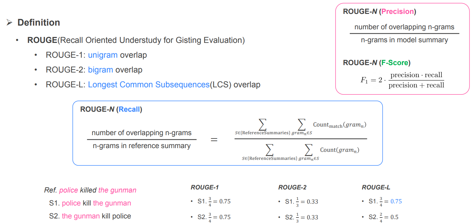 - 평가방법 : Rouge metrics