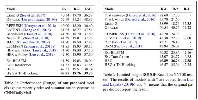 - Trigram blocking : sentence를 score 순서로 내림차순 한 이후 겹치는 trigram이 있는 문장을 제거하는 과정