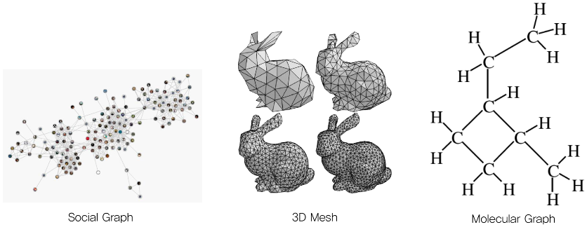 - GNN의 경우에는 input이 그래프 구조라는 특징이 있음 (ex. 영상에서의 graph, 분자구조 graph, Social graph ...)