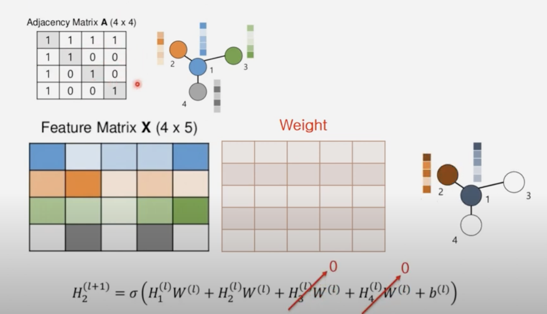 2. 주변 노드의 정보를 가져오기 위해 Adjacency Matrix를 곱해줌