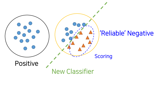1. 모든 Unlabeld dataset을 negative로 취급하여 P vs N를 분류하는 clf 모델 학습