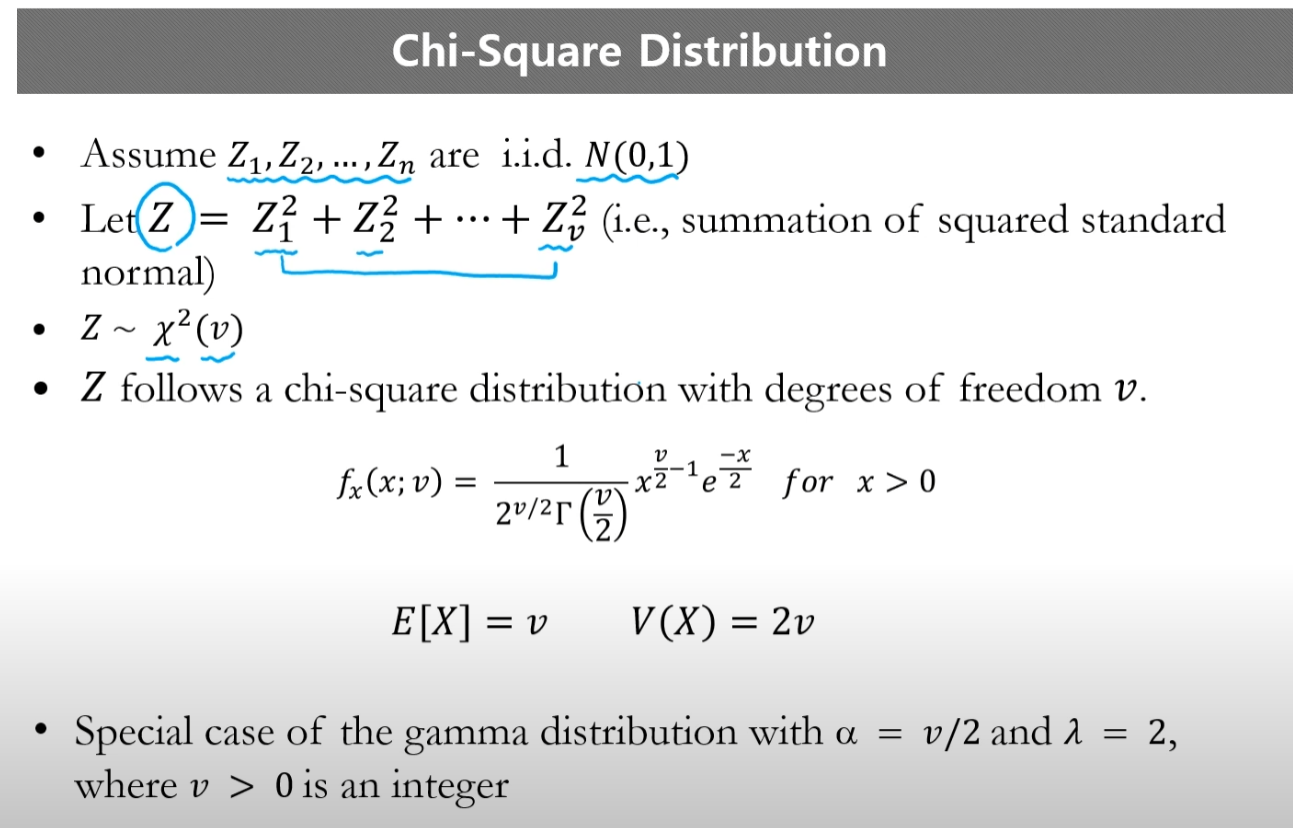 - 자유도 : 샘플수(n) - 1, 1은 평균값으로 자유롭지 않아서, 확인해야하는 자유로운 관측치는 n-1이기 때문에 이것을 자유도라 부름 or permutation 문제에서 마지막은 무조건 한개가 남아 선택권이 없다. 예를 들면 5명이 5개의 물건을 선택하는데, 4명이 선택을 하고 나면, 나머지 한명은 자연스럽게 남은 1개만 가져가기때문에 선택의 여지가 없다. 선택권은 실질적으로 4명에게 있는 것이므로 5-1 = 4 가 자유도가 된다.