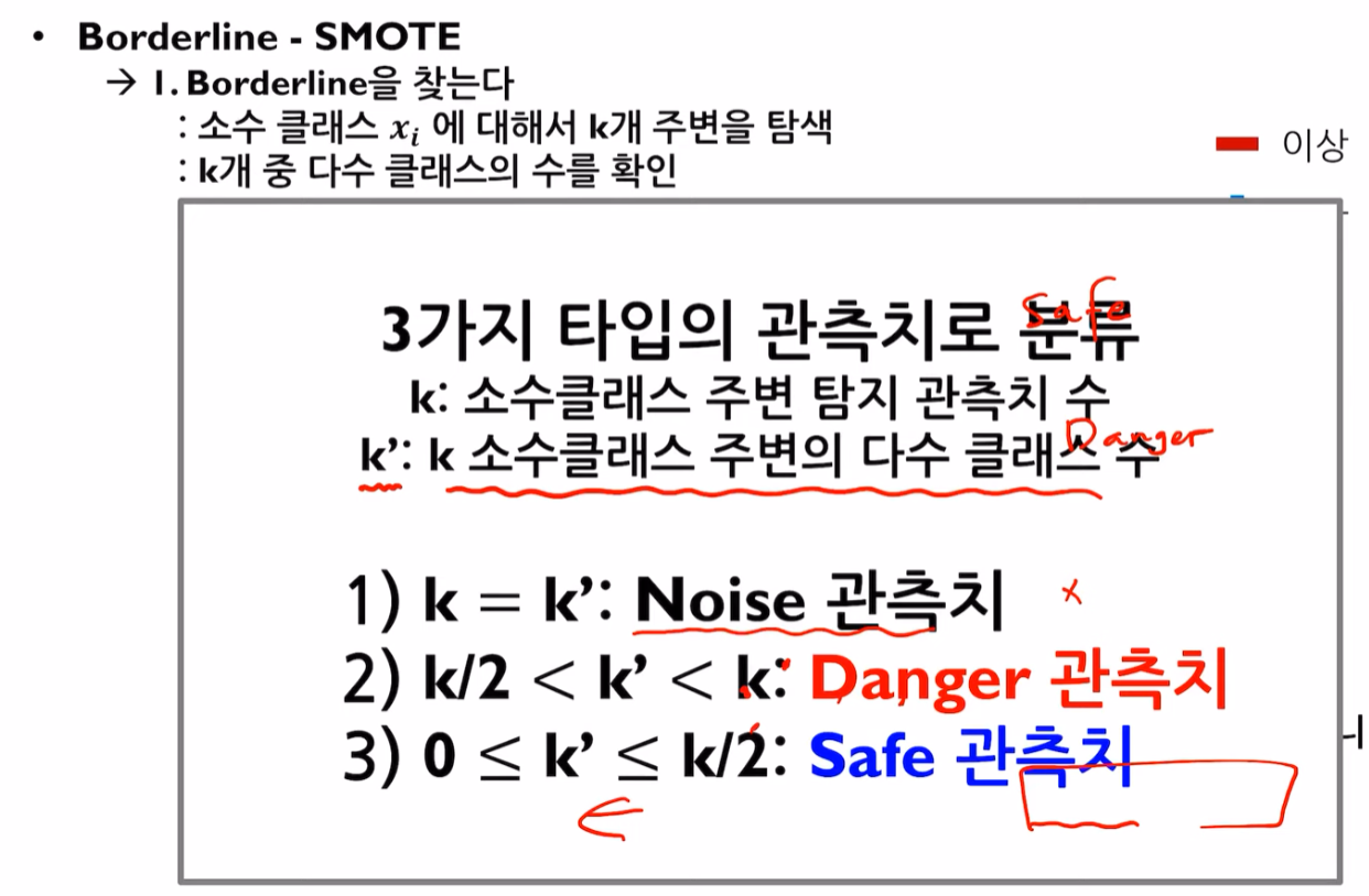 > 소수 클래스의 하나를 선택하여 k개의 주변을 선택했을 때, 소수 범주 데이터가 아닌 다수 클래스에 선택하는 주변점 갯수가 많을 경우 선택
