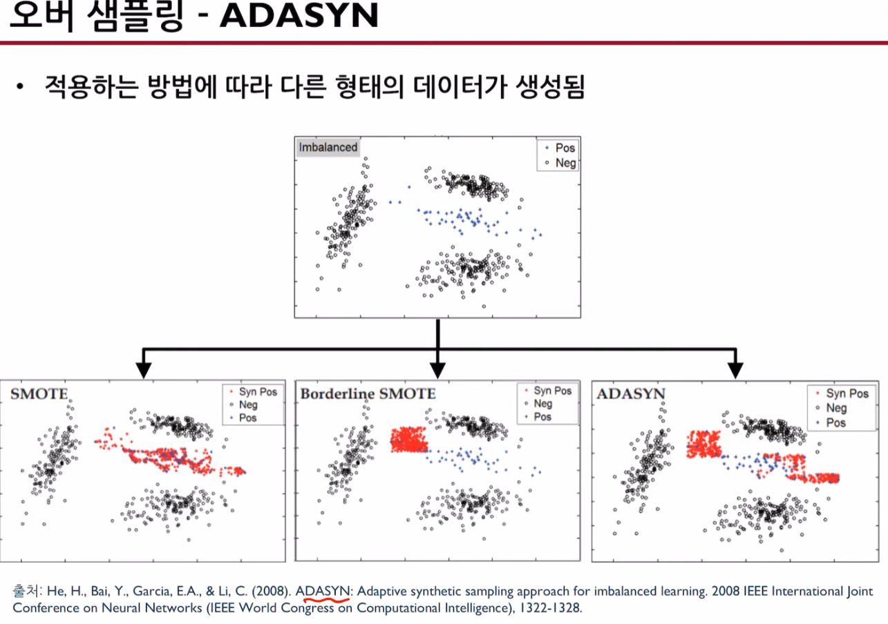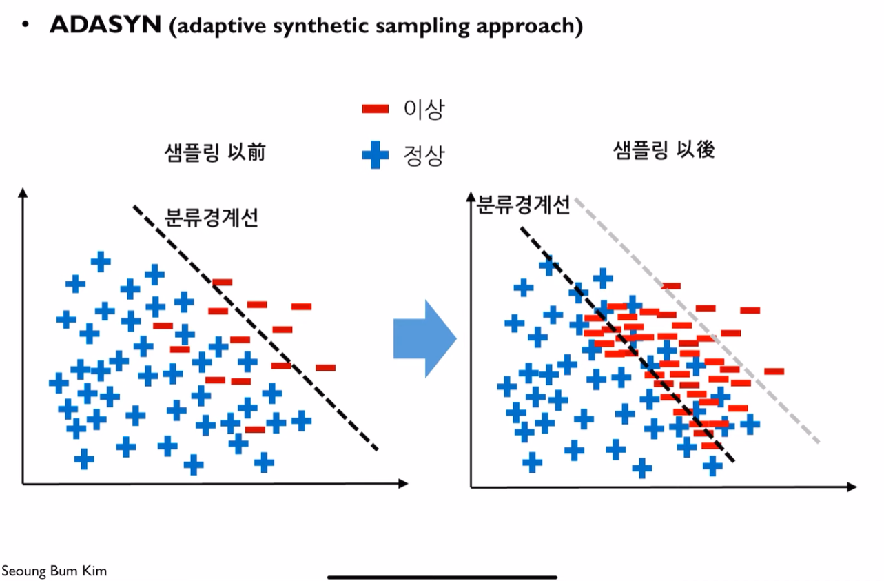 - ADASYN도 결국 SMOTE를 적용하는 개념 → 소수 클래스의 케이스에 따라 다르게 데이터를 생성하는 것 일 뿐