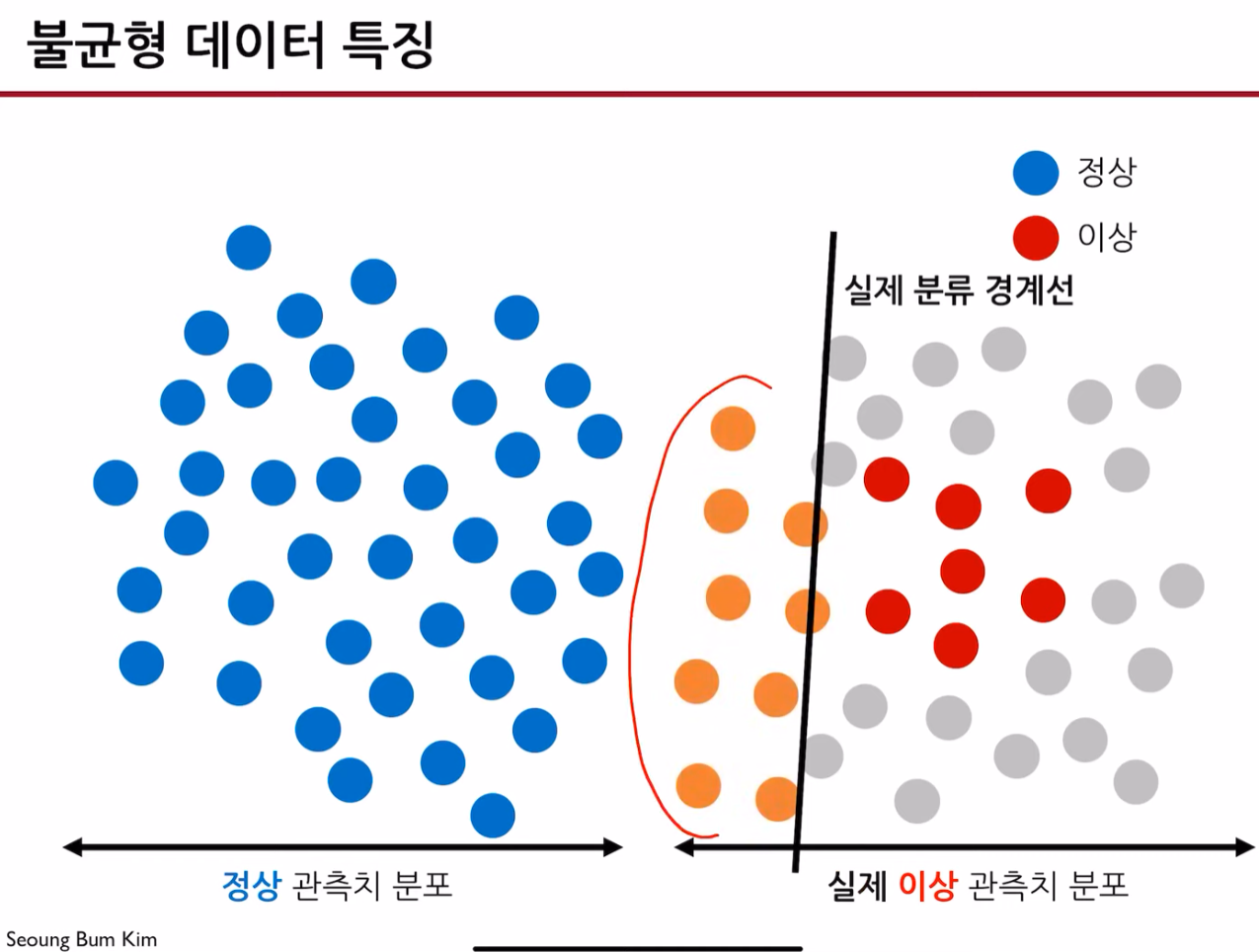 - 데이터의 불균형으로 인해 모델을 학습시키면 정상데이터에 대해 분류 경계선을 만드는 모델로 학습이 될 것이기 때문에 잠재적인 이상 데이터에 대한 예측 정확도는 낮아지는 문제가 있음