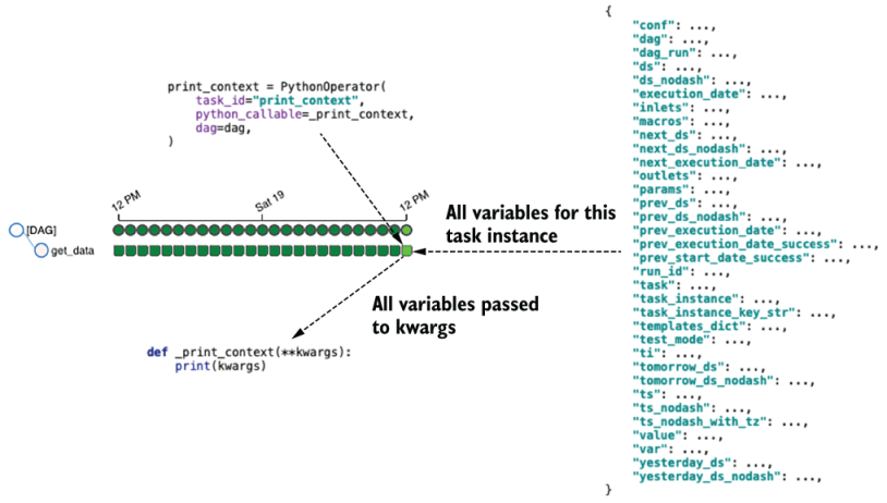 - 이러한 매개변수 중 가장 중요한 변수는 DAG이 실행되는 날짜와 시간을 나타내는 execution_datedla