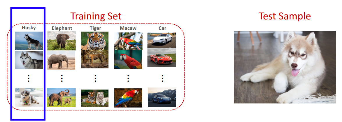 - Supervised learning : Test image ( Query image ) 의 클래스가 Training set에 있음!! -> 학습에 강아지 사진을 주고 강아지를 잘 학습했는 지 묻는 것!