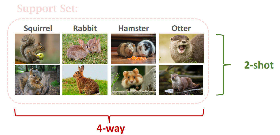 - Support set의 클래스 개수와 샘플 수를 기준으로 k-way n-shot 이라는 표현