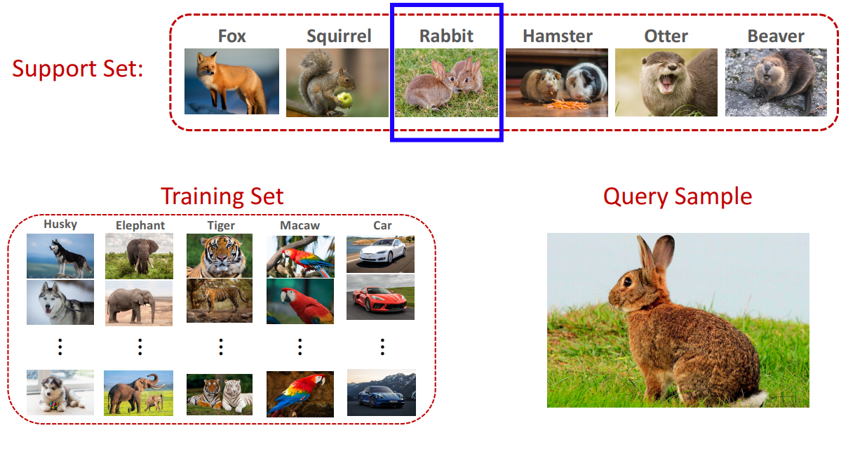 - 한 클래스당 일부 샘플 이미지만 사용하여 새로운 클래스를 인식하는 것
