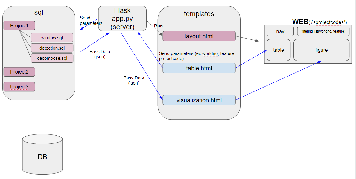 app.py 에서 server 관리, 데이터 전송(to html) 및 figure 생성(bokeh),