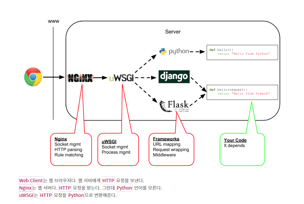 NGINX는 파이썬언어를 읽지 못한다. 그래서 uWSGI라는 녀석을 통해 python파일(app.py)을 http 형식으로 변환시켜 해석하고, 이것을 브라우저에 띄워주는 개념이다.