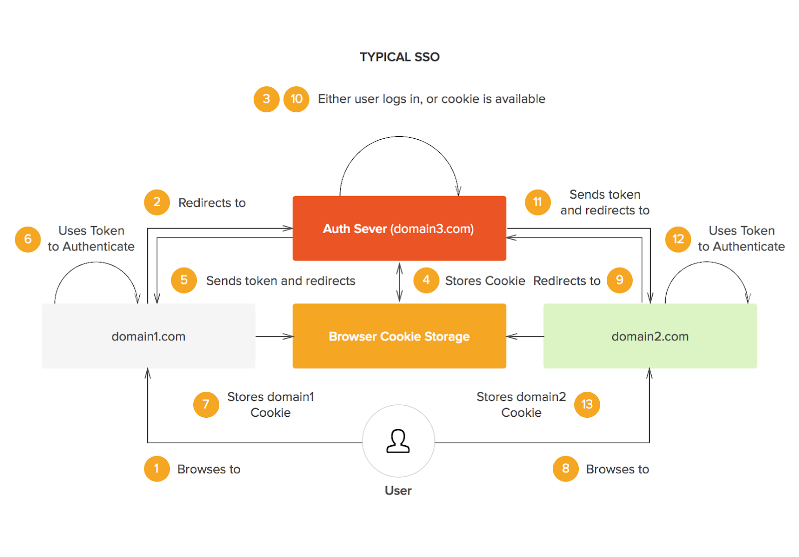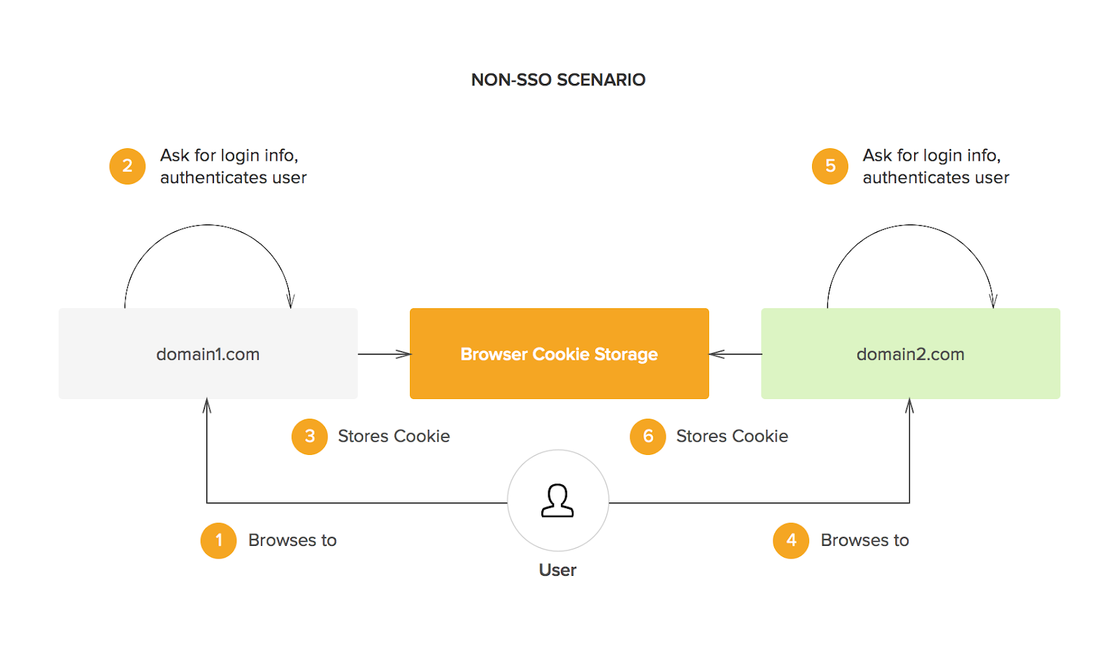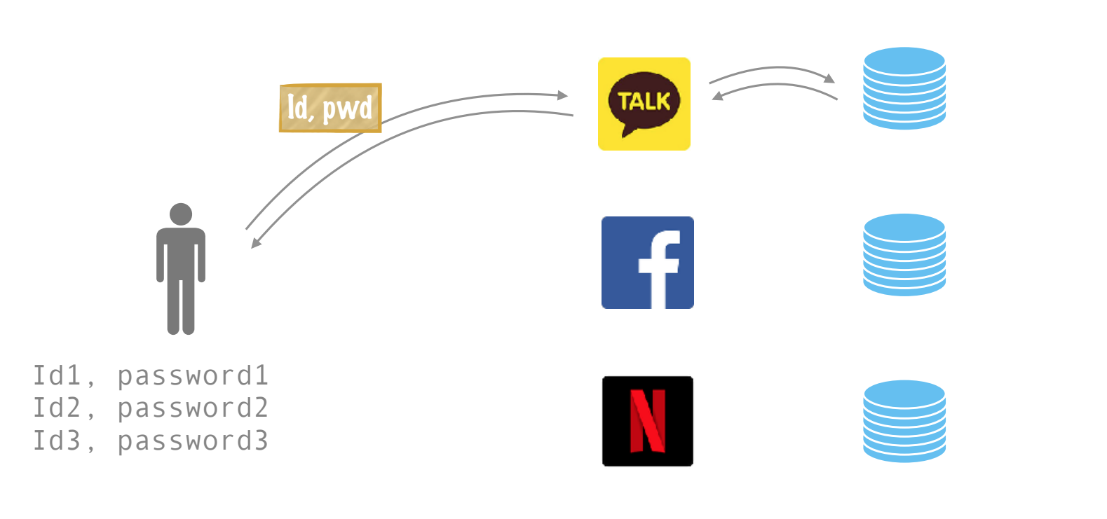 한사람이 세개의 도메인에 접속하려면 각각 로그인하여 각 도메인이 가지고 있는 DB에서 로그인 정보를 확인 후 인증을 받게 됨