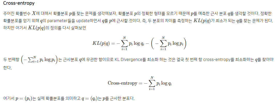 Cross entropy는 negative log likelihood와 같습니다. 그래서 cross entropy를 minimize하는 것이 log likelihood를 maximize하는 것과 같습니다. 그리고 확률분포 p,qp,q에 대한 cross entropy는 H(p)+KL(p|q) 이므로 KL-divergence를 minimize하는 것 또한 결국 log likelihood를 maximize하는 것과 같습니다.
