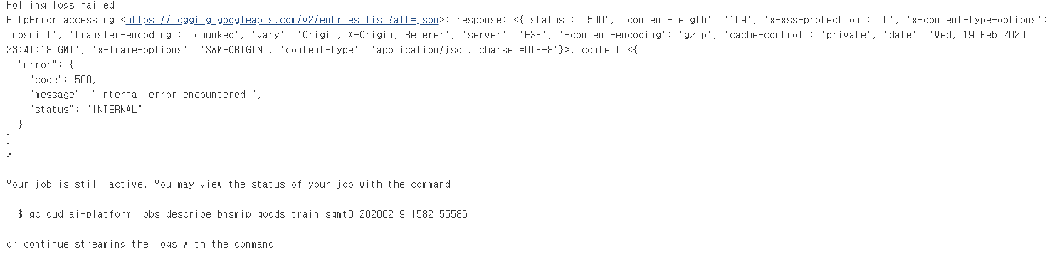그러나 gcp 내부에서 stream-logs 관련 에러가 나게 되면 파이프라인 자체가 종료되기 때문에 학습은 되더라도 다음 단계인 예측-결과적재 부분의 stage가 실행되지 못한다.