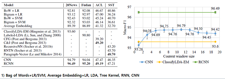 RNN을 통해 단어의 문맥상 의미를 도cnf하고, CNN을 통해 분류를 위한 핵심 Text를 추출함